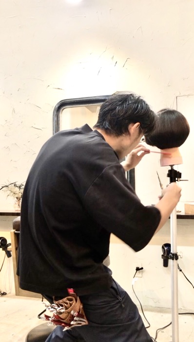 カット朝のトレーニングで、昨日決めたヘアスタイルをカットしたんですが、同時にカットの姿勢を動画に撮ってみました。