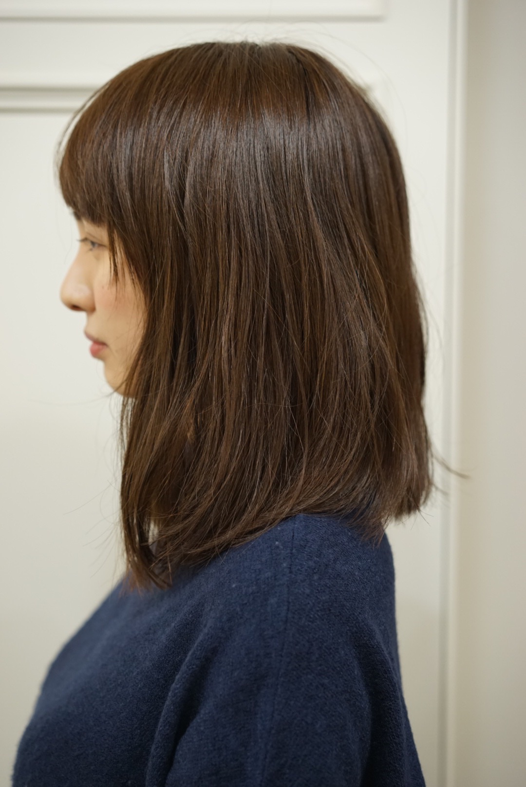 パーマが軽やかに見えるよう、緩やかな前上りにしました。
