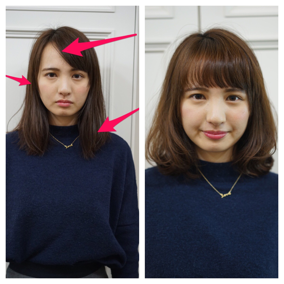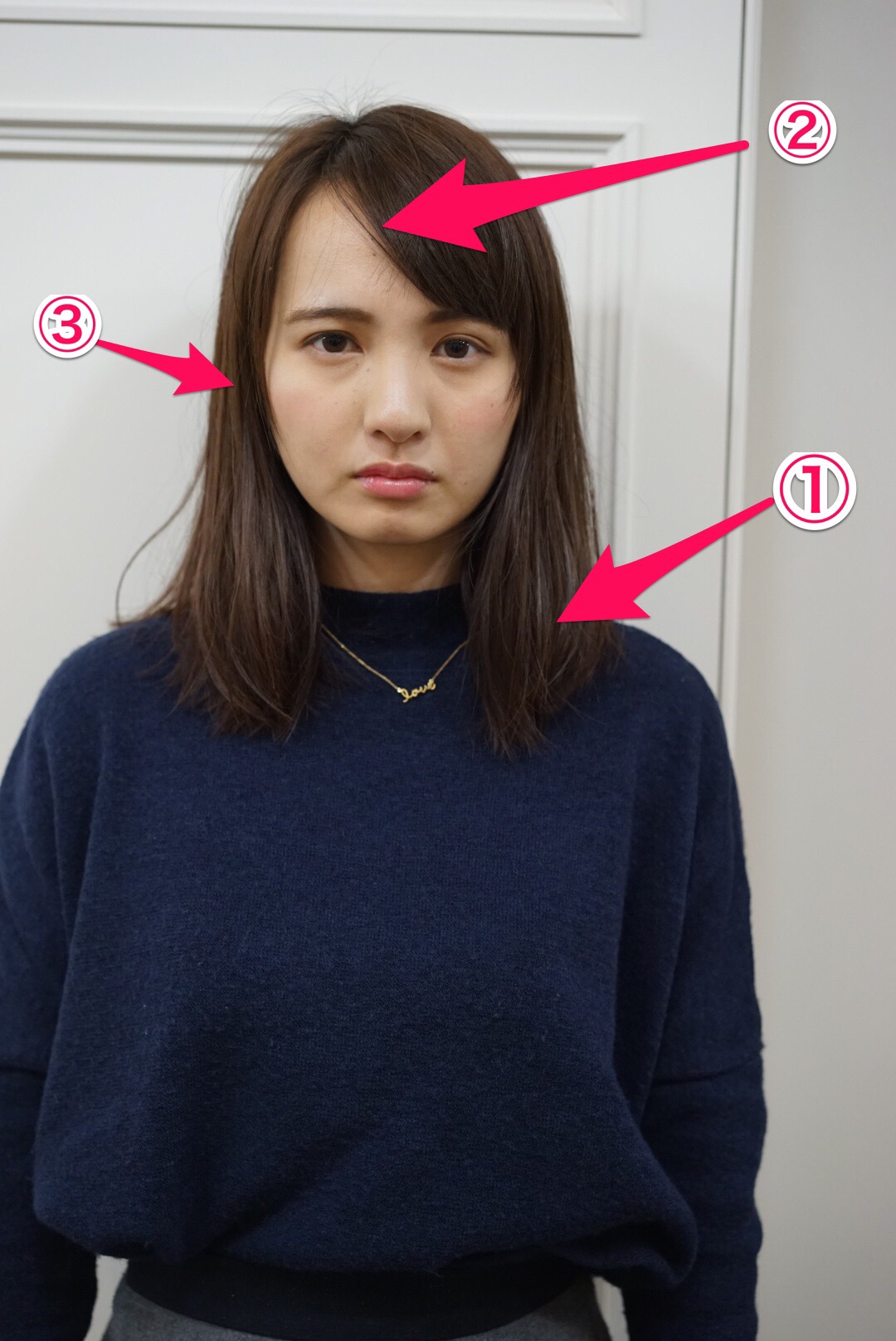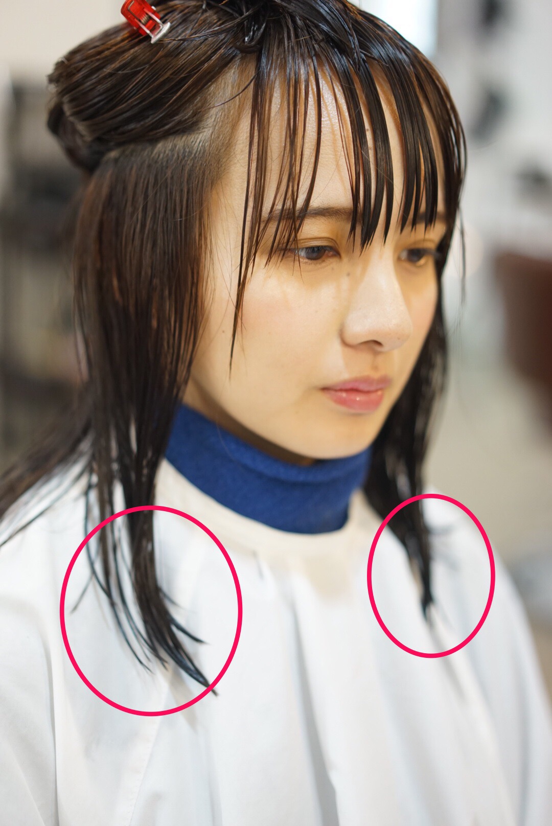 ②ぱっくり別れた前髪によって第一印象の雰囲気が重くなってしまう。