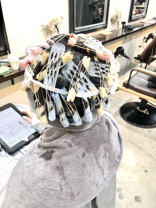 オーダーはシンプルだが、ハイライト2回分入ってる髪に対して、強めのパーマ。
